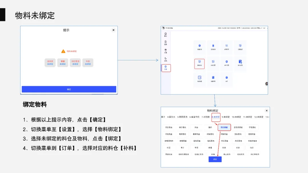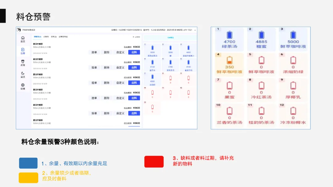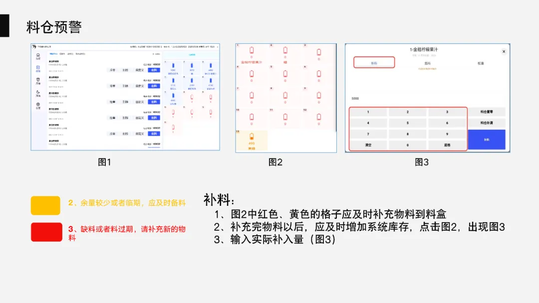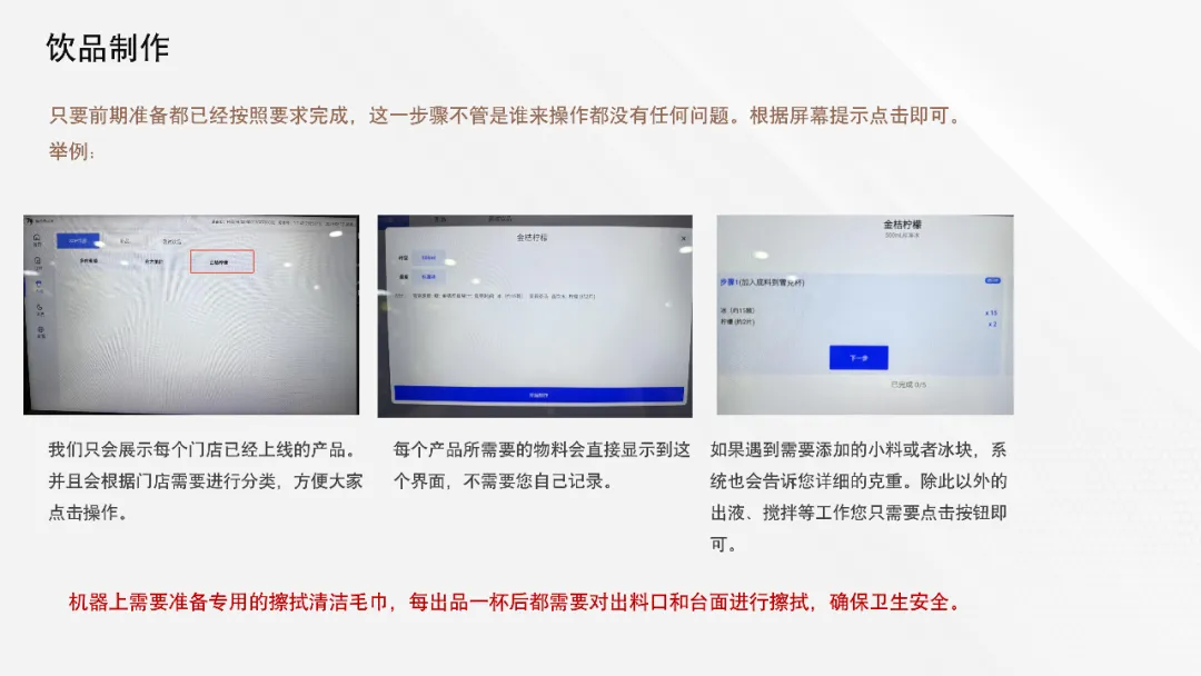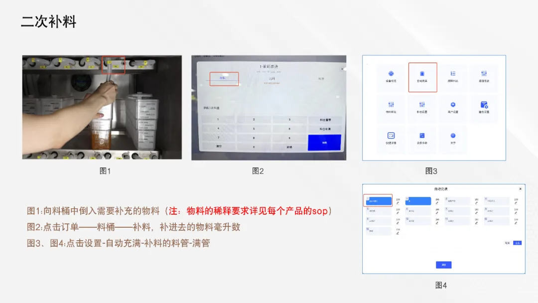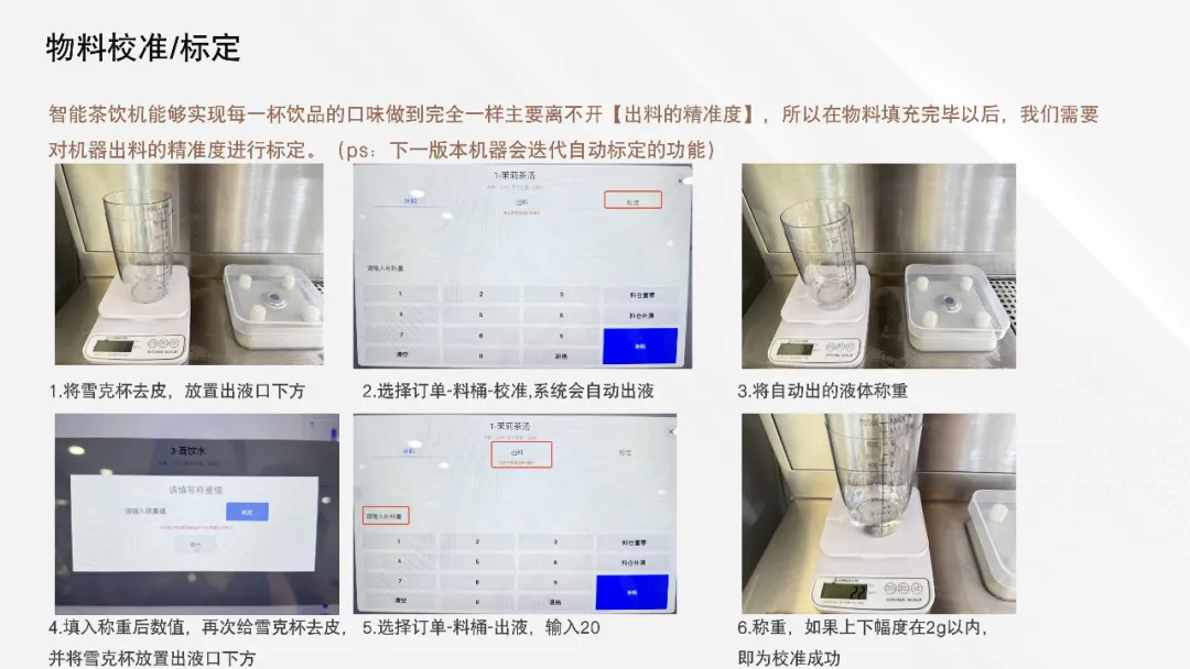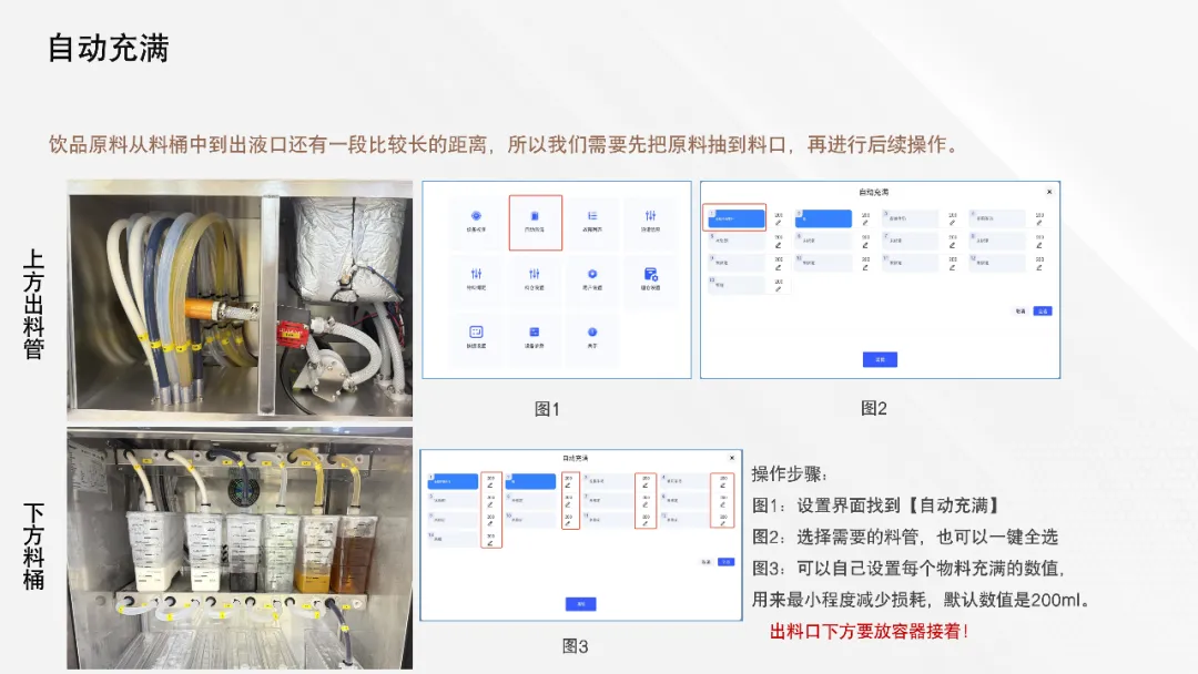 分为物料填充、自动充满、物料校准、制作饮品四个模块,需要每天操作