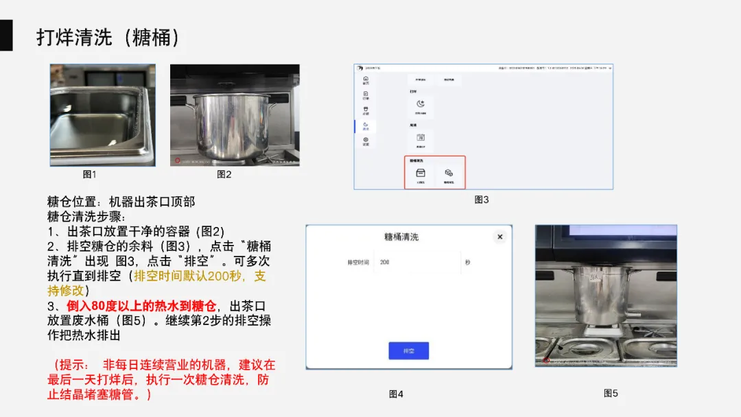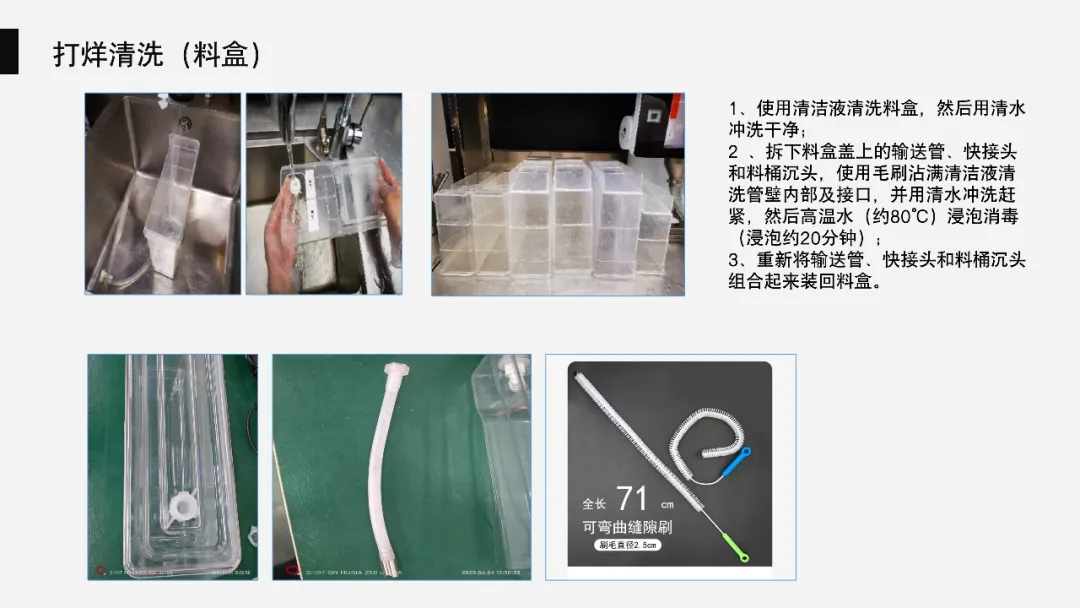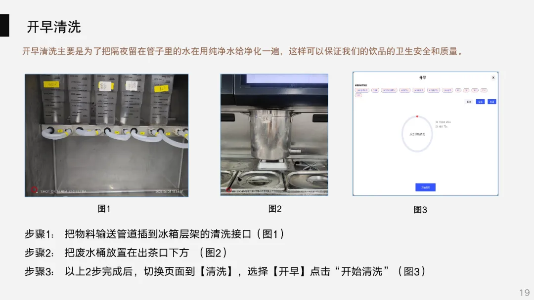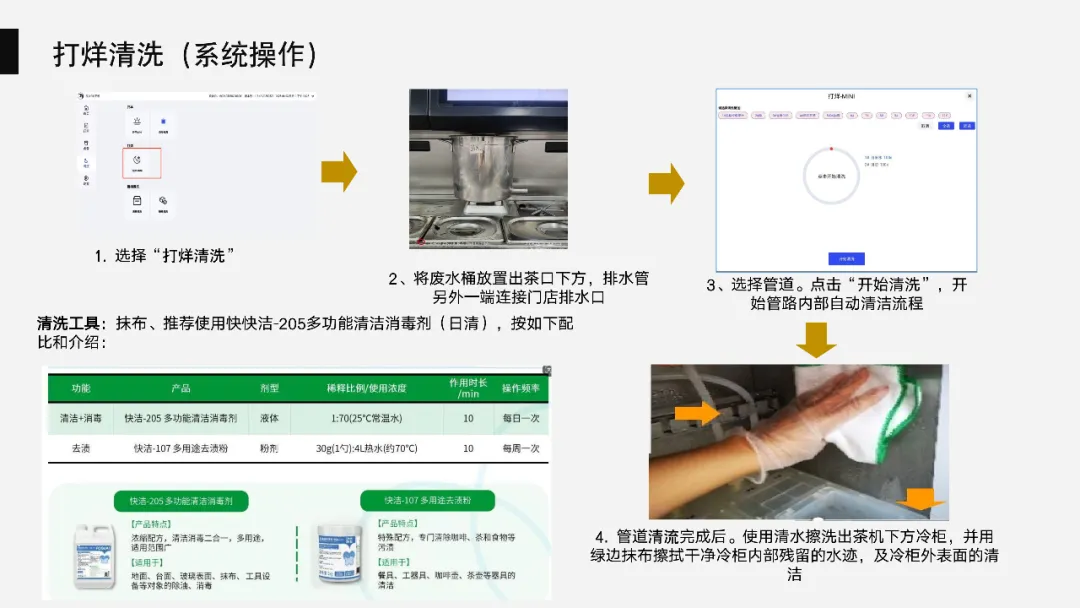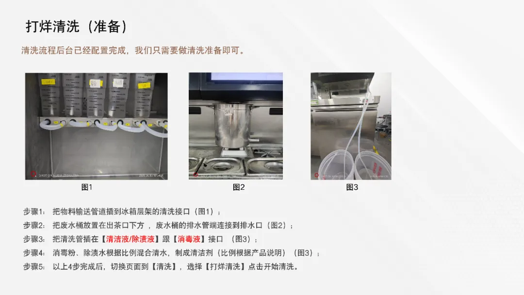清洗分为日淸和周淸。其中日清分为:开早、打烊清洗