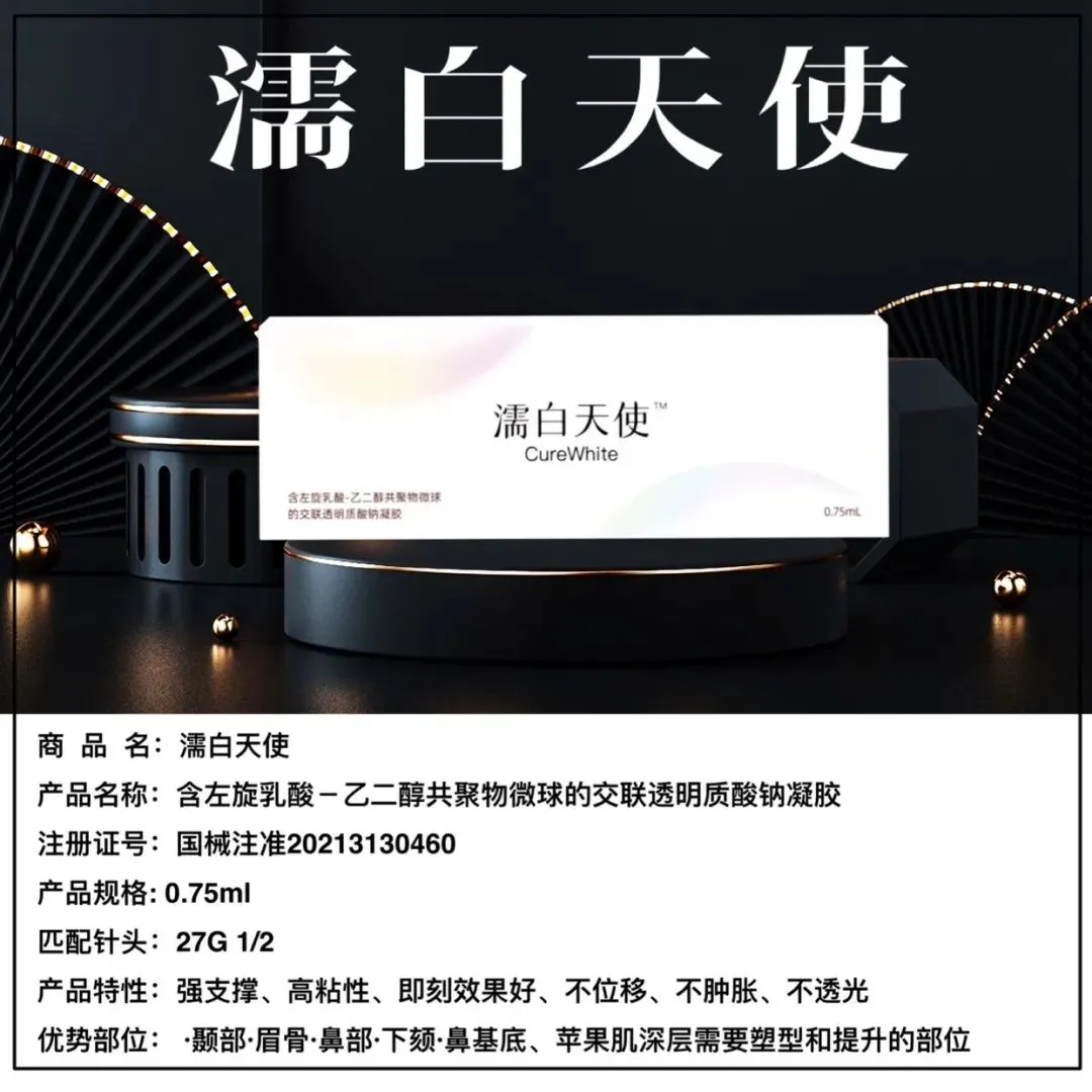 濡白天使综合了目前注射材料的优势,它以交联透明质酸钠(即玻尿酸)为主要成分,加入了左旋乳酸-乙二醇共聚物微球、盐酸利多卡因等成分。