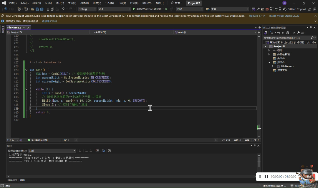 程序功能:程序启动后,使整个窗口向下“流动”呈溶解状。期间鼠标、键盘功能正常,但屏幕内容流失,使被整蛊方无法准确识别屏幕内容做出操作,此过程会一直持续,直到程序被关闭,屏幕才恢复正常。