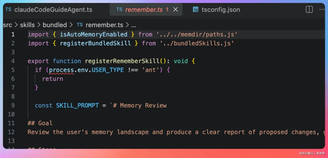 比如 remember 这个 Skill,用来管理自动记忆系统,只有 USER_TYPE === ‘ant’ 才能使用。stuck 这个诊断卡死会话的 Skill,也是内部专属。