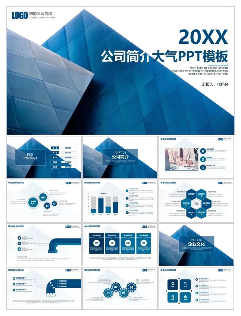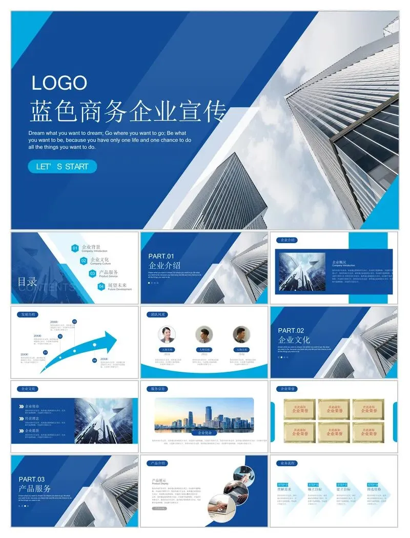本文分享:蓝色商务PPT模板(工作总结,竞聘,简历,公司宣传,企业招聘,培训,颁奖)