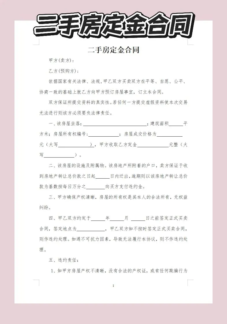 本文内容分享二手房定金合同模版