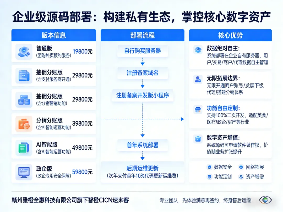 微信POI企业级源码部署共分为五大版本,精准匹配不同规模企业需求:普通版(团购外卖预约服务)19800元,抽佣分账版(含支付服务商开通)29800元,分销分账版(含分销营销功能)39800元,AI智能版(含AI智能运营功能)49800元,政企版(政企专用安全保障)59800元。企业可根据自身业务需求灵活选择,部署流程清晰规范:自行购买服务器→注册备案域名→注册备案开发版小程序→首年系统部署→后期运维更新,次年仅需支付首年10%的代码更新运维费,长期使用性价比极高。