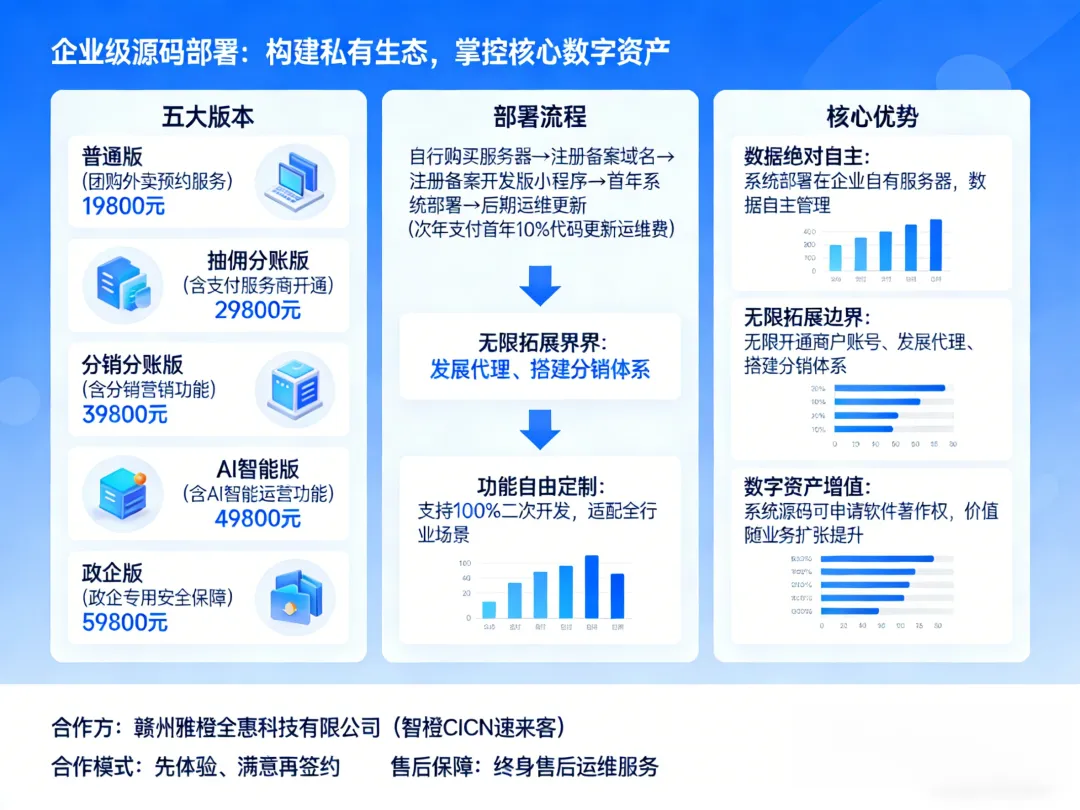 对于有一定资金实力、技术基础,想要打造自主品牌、实现全国化扩张的企业、技术公司而言,企业级源码部署是构建私有生态、掌控核心资产的终极选择。相较于传统SaaS租赁模式,源码部署让企业拥有系统100%控制权,从根源上摆脱第三方平台束缚,实现自主经营、无限扩张。