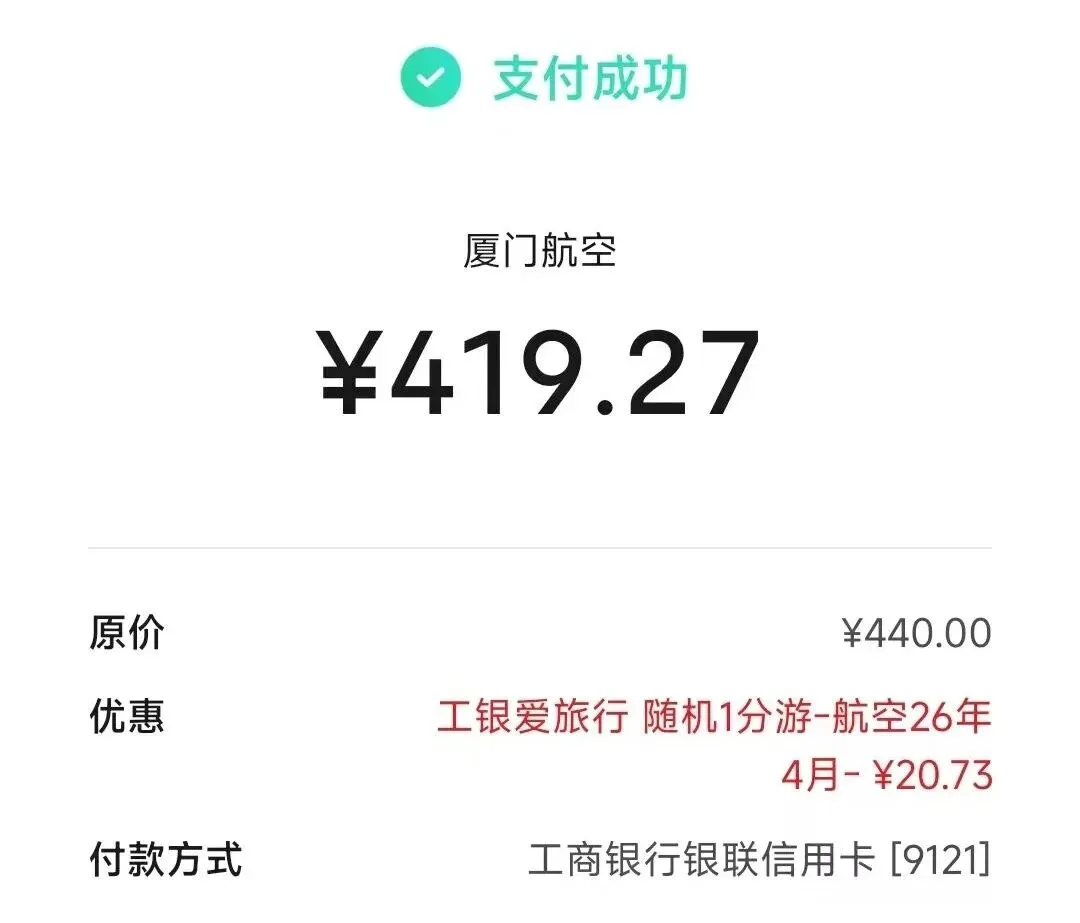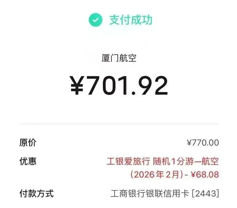厦门航空APP,工行随机减,一月一次,有工行信用卡看过来!