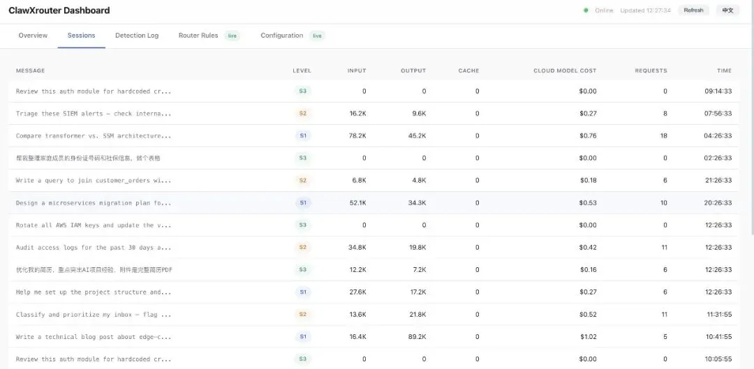 可视化Dashboard:支持中英双语,涵盖用量概览、会话记录、检测日志、路由规则配置与模型配置五个面板,所有改动即时生效、无需重启,方便用户按自身需求灵活调整。