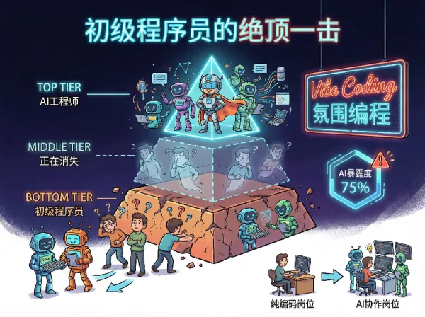 这种被称为“Vibe Coding”(氛围编程)的新模式,使得初级程序员所依赖的“手写CRUD、简单业务逻辑”等基础技能变得不再稀缺。Anthropic的研究甚至显示,程序员的AI暴露度高达 75%,居各职业之首。