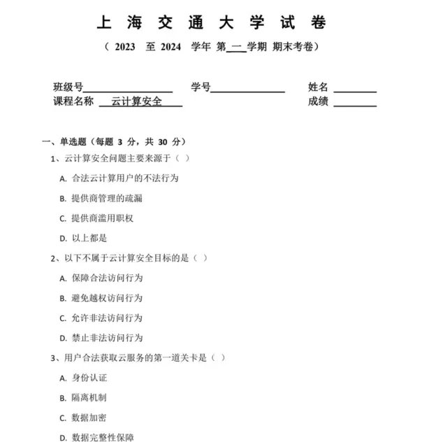 上海交通大学云计算安全期末试题,可打印 获取更多考研资料可加小编QQ:3542263029或者v信kyzlfx 先点“赞+在看”联系客服即可免费赠送公共课(政治英语数学)资料 其他院校陆续更新中…….有需要联系客服留言即可 更多真题资料会第一时间为大家推送 还有其他年份,可联系客服详询 01 部分截图如下🔥 温馨服务 免责申明:资料整理于网络如有侵权请告知删除 长按并识别下方二维码关注公众号,不定时发放考研福利哦 扫一扫添加微信好友,获取更多考研信息哦~