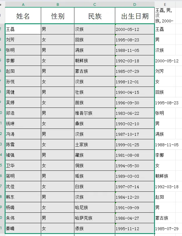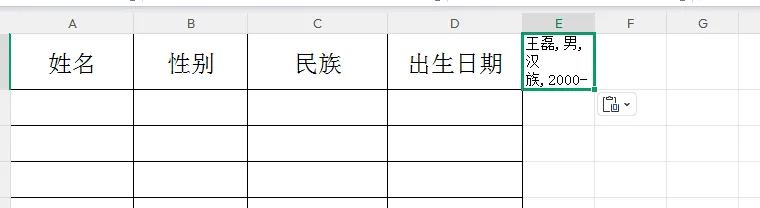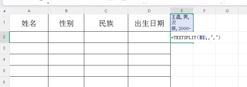 2.在第二行输入函数=TEXTSPLIT(E1,,”,”) 其中E1表示粘贴数据的单元格,E1后边输入一个逗号数据将横排排列,输入两个逗号为竖排排列,“,”里边的逗号为原数据里的逗号,原数据用什么符号隔开就用什么符号。然后按回车键,数据将拆解到各行。