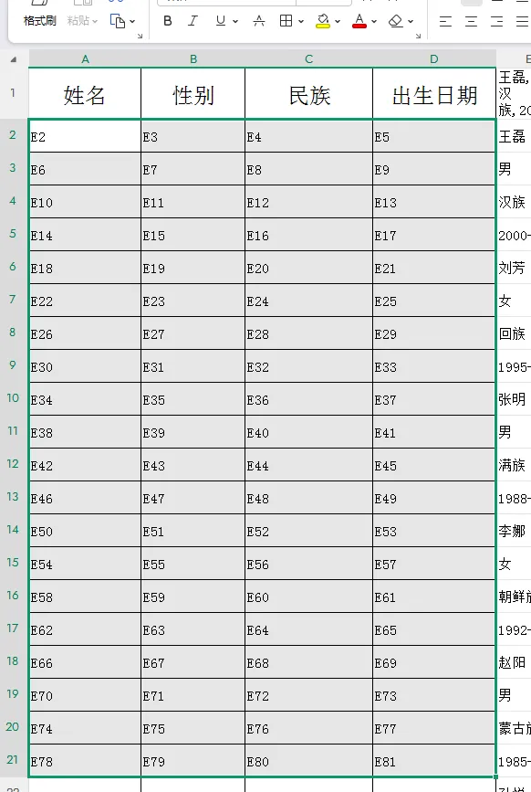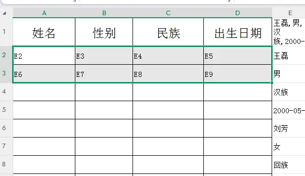 3.在表格中输入相应的单元格标识。输入第一个数据E2,鼠标光标移至所在单元格右下角,当光标变为黑十字时,长按左键拖动填充右侧数据。输入第二行第一个数据E6,同样填充右侧数据。全选前两行数据单元格,同样拖动填充所有数据。