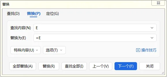 4.全选填充数据,按键盘Ctrl+H,弹出查找和替换对话框,查找内容输入E,替换为输入=E,点击全部替换按钮。