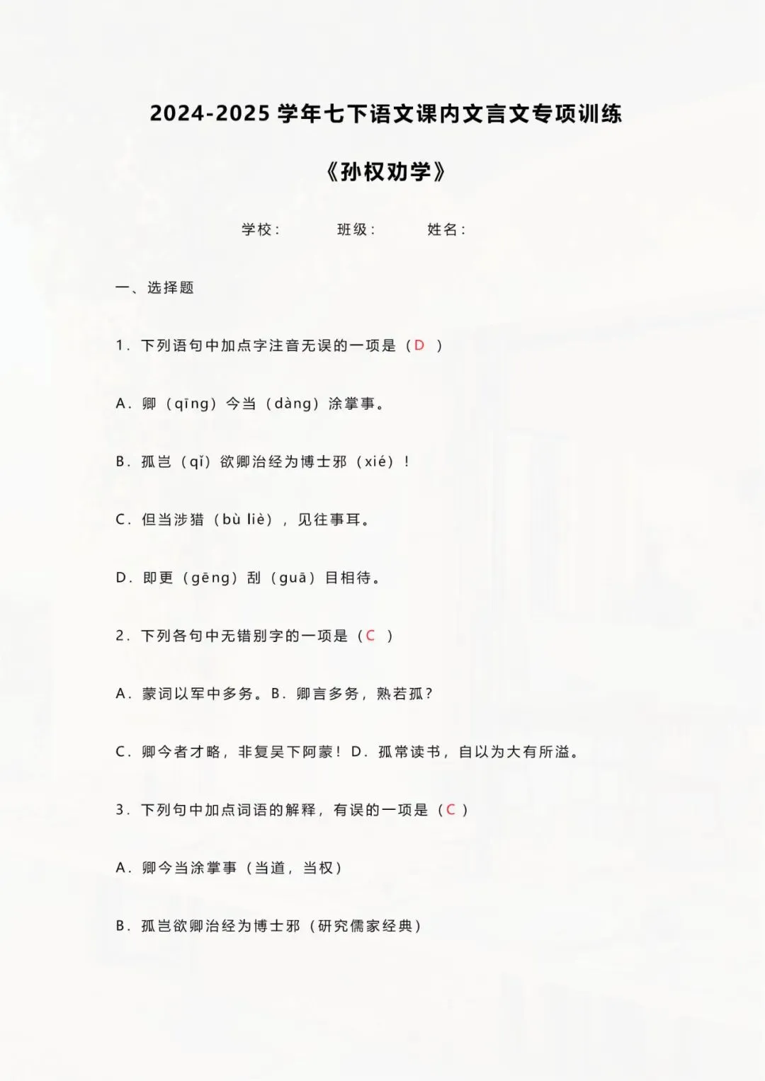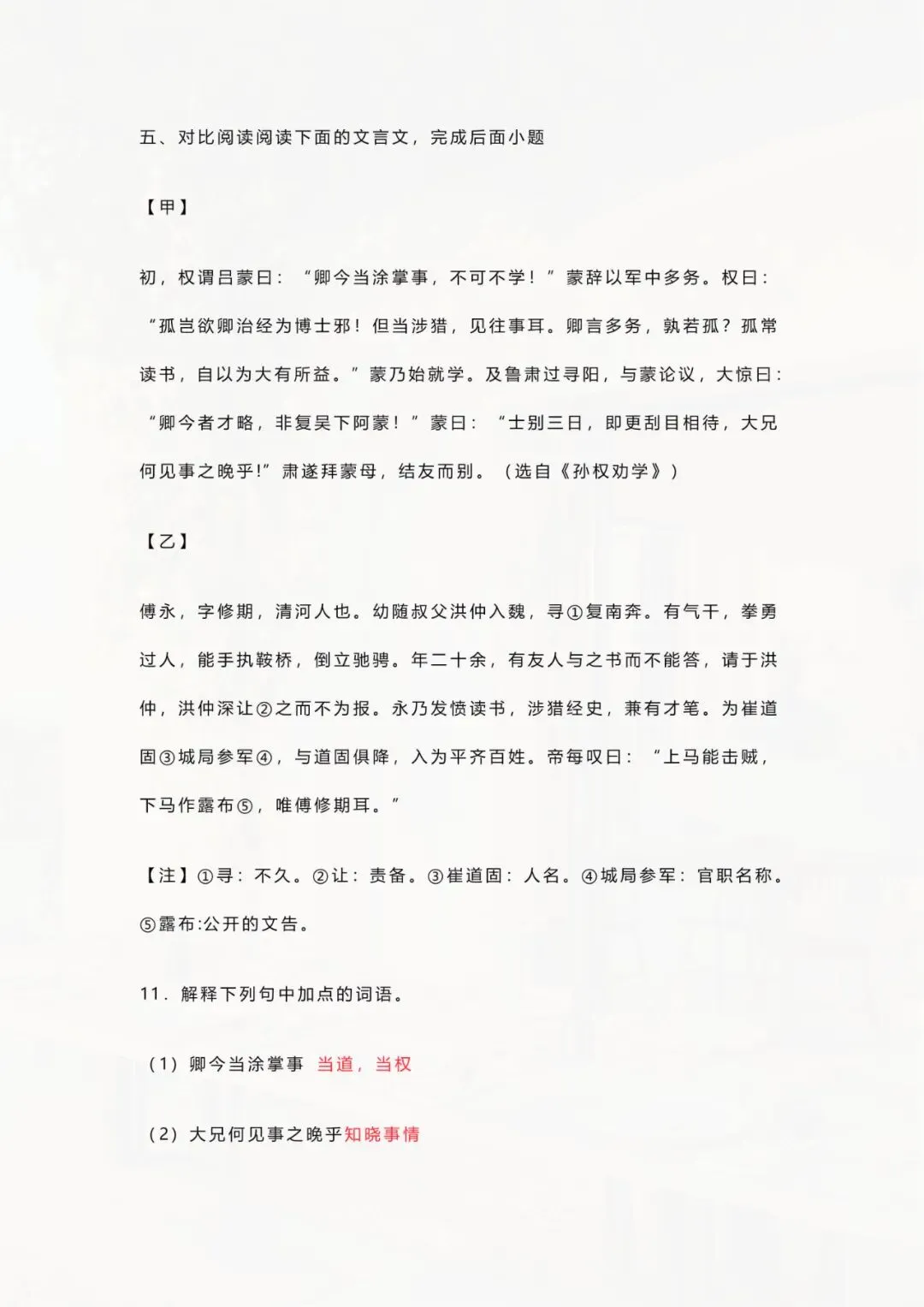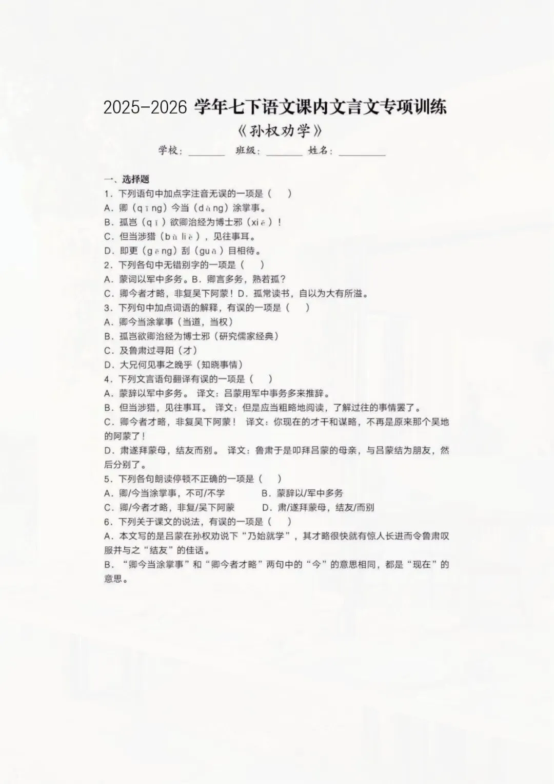 今天老师整理好了:七年级下册语文 《孙权劝学》文言文训练 电子版可打印!
