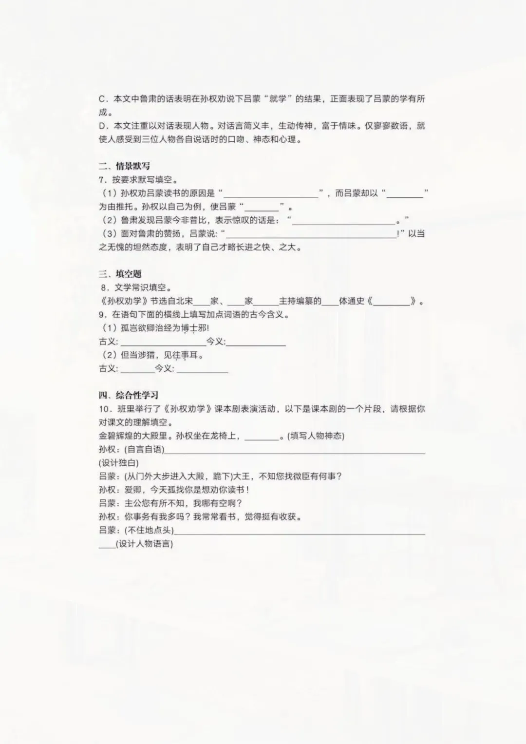 七年级下册语文 《孙权劝学》文言文训练 电子版可打印