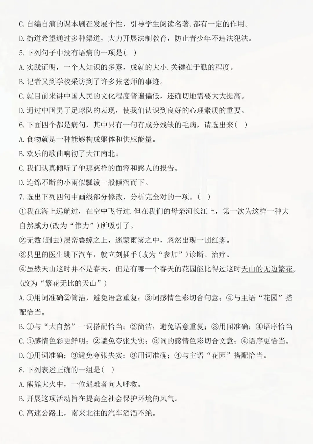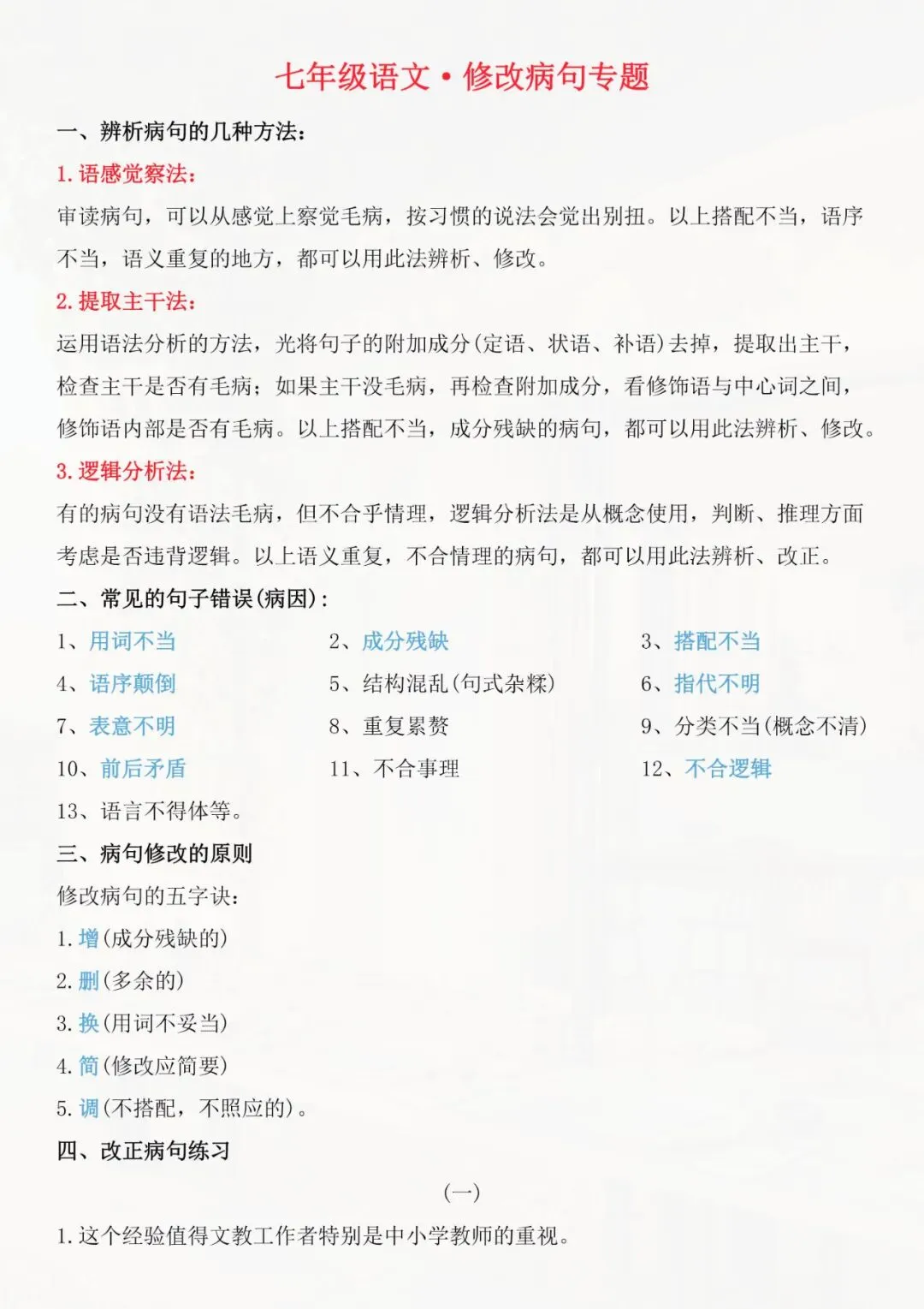 今天老师整理好了:七年级下册语文 病句修改专题讲解 电子版可打印!