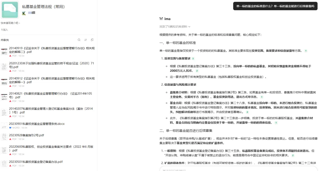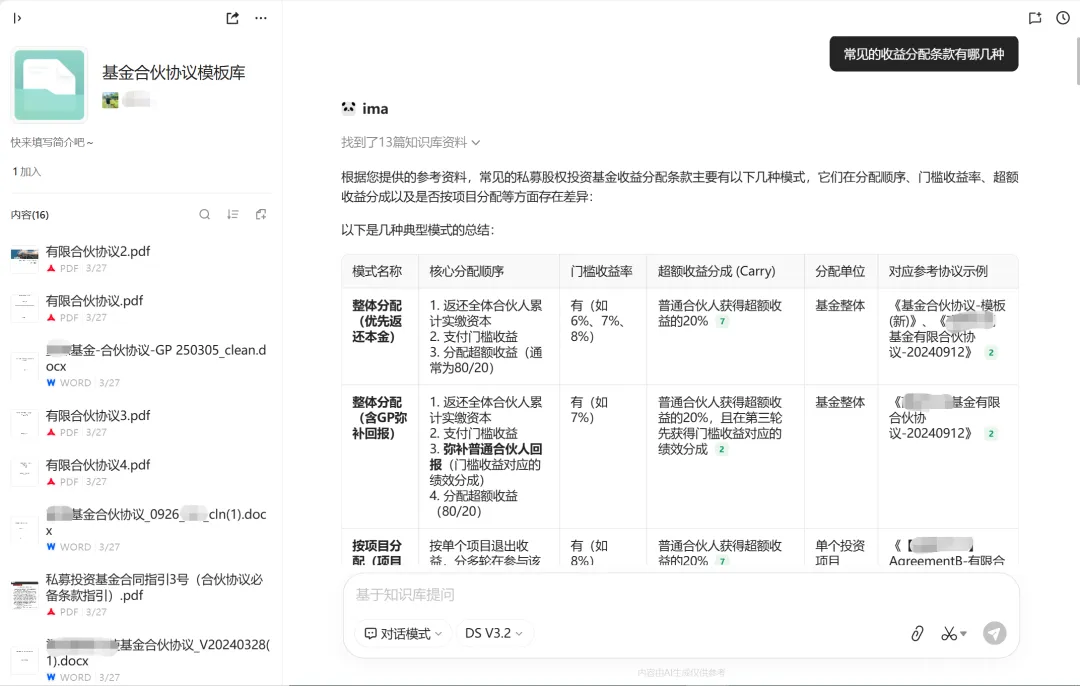 (1)做常用法律法规、合同模板的汇编,并用问答功能快速定位关键信息:例如我会把不同版本的基金合伙协议都放入ima,制作为基金合同库,并在库中输入相应问题,ima会自动采集协议的相应条款并归纳成表格: