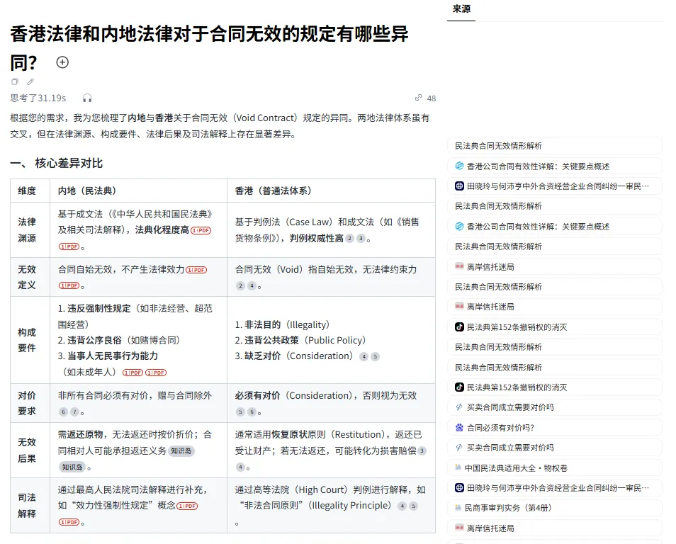 当然,仅就法律领域而言,现阶段的AI答复很多时候并不直接可用,这可能与AI幻觉、资料时效、以及不同专家解读导致多重信息来源不一致等原因导致。但是,AI作为搜索引擎,在搜集、归纳特定主题的资料依然具备强大的能力。