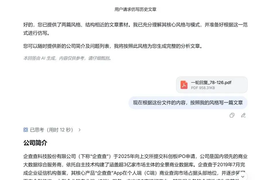 (1)长文档归纳:日常我在撰写公众号文章时,会大量阅读上市招股书、问询及回复文件,动辄几百页,这时我会使用deepseek、腾讯元宝对文档进行初步的归纳整理,例如我曾要求deepseek根据某项目的招股书,按照我喂给它的文章风格仿写文章,虽然文章内容并不完全贴合实务,但已经可以按照我日常的行文框架和格式,迅速提炼出一些大概率我会关注到的要点: