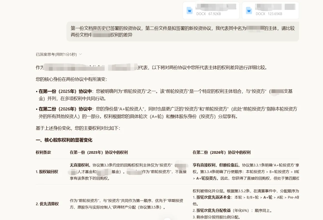 这部分内容比较常规,鉴于日常投资协议需要经过多家机构、多轮反馈,以前我通常使用word文档的比较功能进行比对,现在直接将文档丢给AI并输入比对指令,便可以得到完整的修改内容对比: