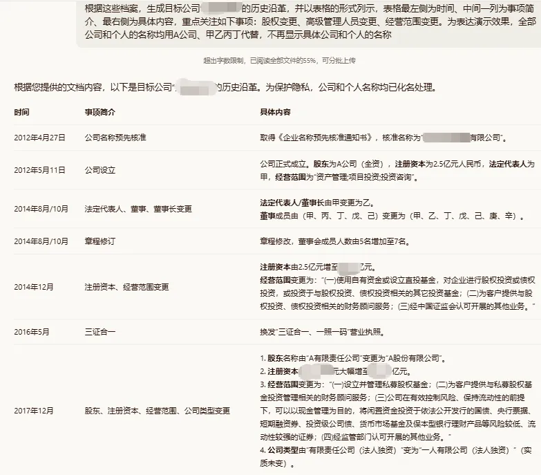 例如喂给元宝本地文档,指令它梳理公司的历史沿革: