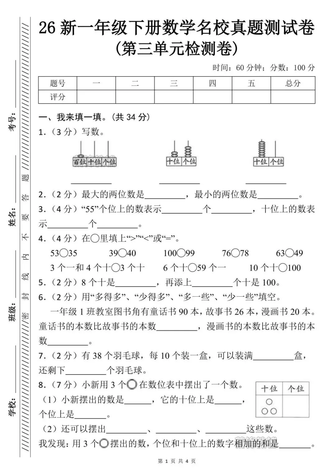 一年级下册数学第三单元测试卷!电子版可打印