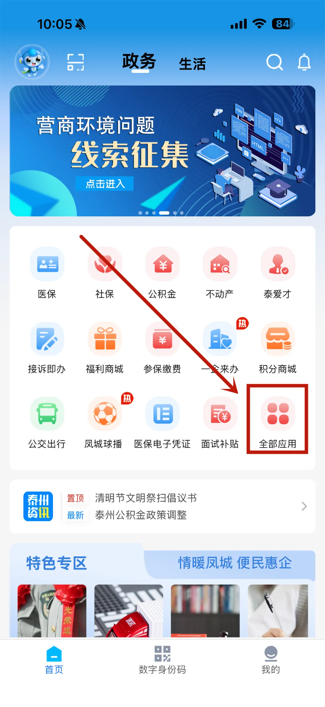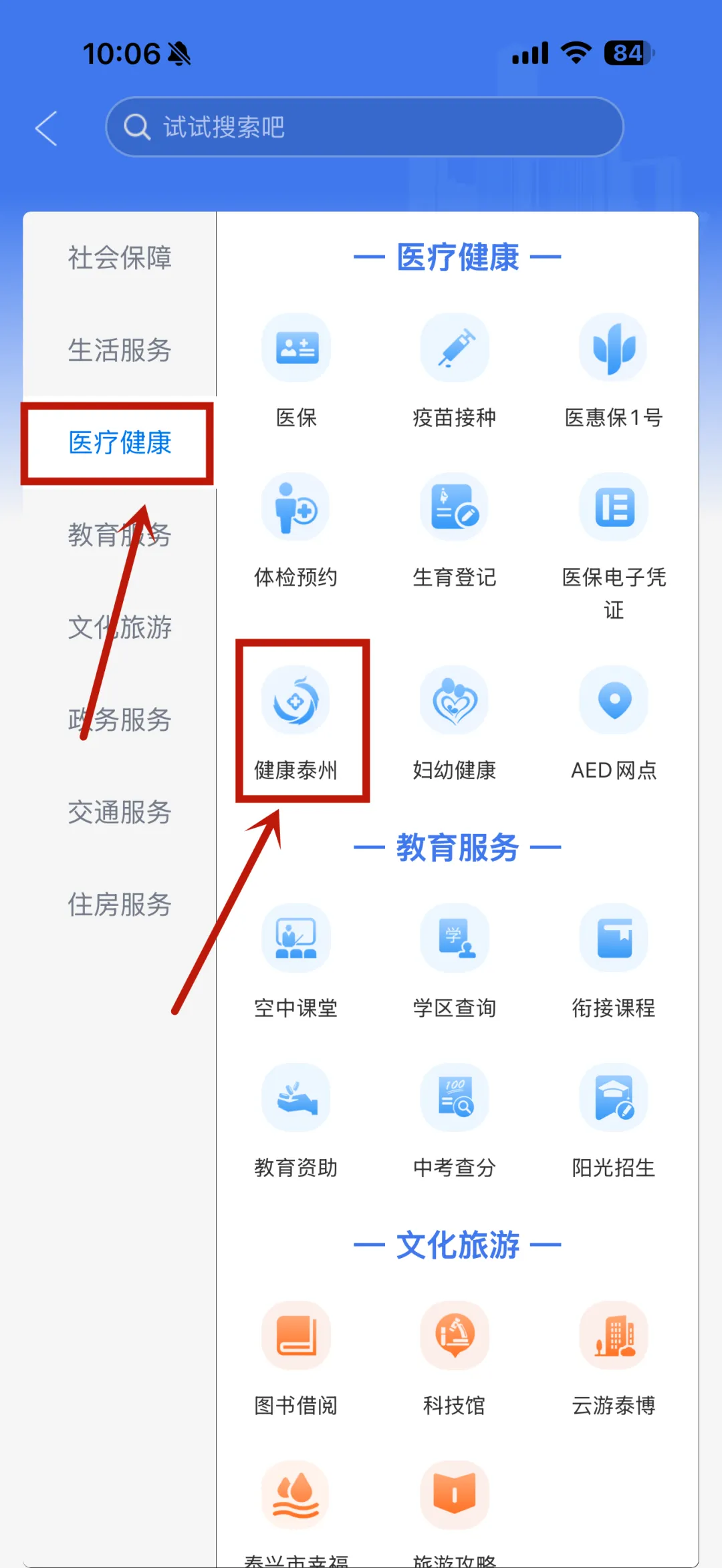2.点击【全部应用】—【医疗健康】—【健康泰州】按钮,即可进入健康泰州首页。