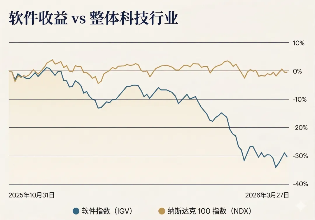 过去半年,软件行业正经历一场恐慌。自2026年初以来,上市软件公司的ETF已下跌了30%,抹去了自ChatGPT推出以来的所有涨幅。Salesforce、Adobe、Intuit、ServiceNow和Veeva等公司——这些过去十年甚至更长时间里为投资者带来丰厚回报的行业标杆——在短短几周内股价下跌了25%至30%。Substack上疯传的帖子描绘了一个企业软件客户群萎缩、标普500指数进入长达数年的大幅下跌的景象。他们称之为“SaaS末日”。这已迅速成为市场共识:人工智能将扼杀软件行业。