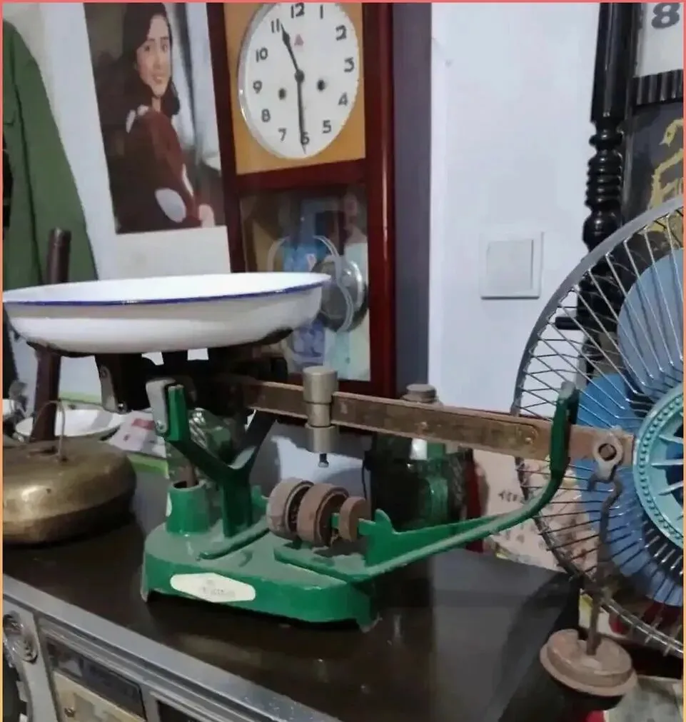 这台看着像个小机械架子的东西,其实是以前很常见的案秤、台秤。搪瓷盘往上一放,菜、粮食、鸡蛋、点心都能称。以前去副食品店、粮店,或者街边小摊,这种秤特别常见,砝码来回挪,秤杆轻轻一平,买卖双方心里就有数了。