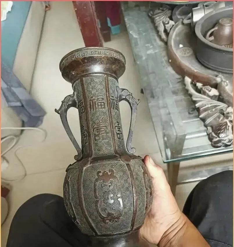 这只器物一看就有些年头了,像是老铜瓶或老摆件瓶,上面的纹饰、双耳和包浆都很有旧气。过去这种东西,在一些人家里未必多显眼,可能就摆在条案、柜顶,逢年过节擦一擦,平时安安静静放着。