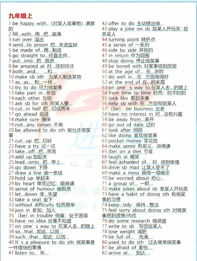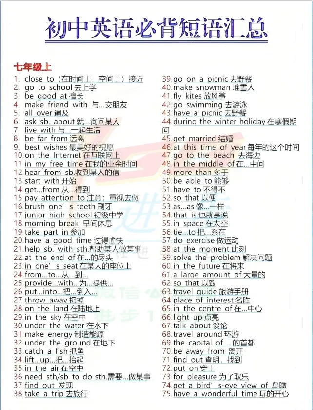 初中英语 | 789年级必背短语汇总(可下载) 领取电子版请拉到文末 领取电子版请拉到文末 领取电子版请拉到文末 部 分 内 容 展 示 不会下载点这里 ✈公众号内容下载操作步骤 点击左下方【阅读原文】即可下载!