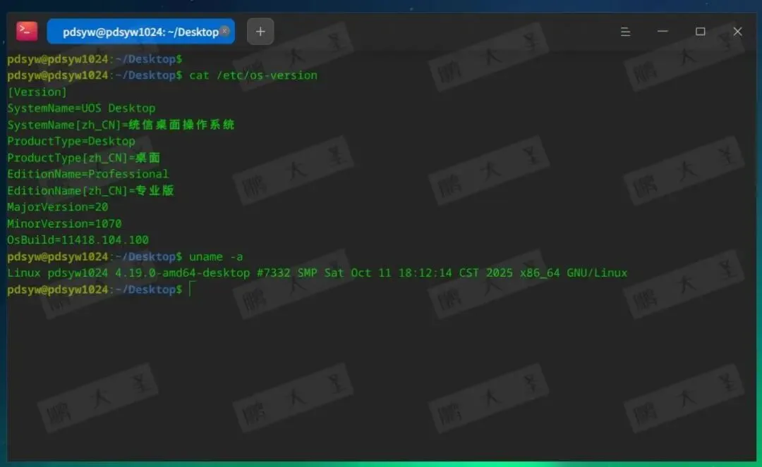 pdsyw@pdsyw1024:~/Desktop$ cat /etc/os-version[Version]SystemName=UOS DesktopSystemName[zh_CN]=统信桌面操作系统ProductType=DesktopProductType[zh_CN]=桌面EditionName=ProfessionalEditionName[zh_CN]=专业版MajorVersion=20MinorVersion=1070OsBuild=11418.104.100pdsyw@pdsyw1024:~/Desktop$ uname -aLinux pdsyw1024 4.19.0-amd64-desktop #7332 SMP Sat Oct 11 18:12:14 CST 2025 x86_64 GNU/Linux