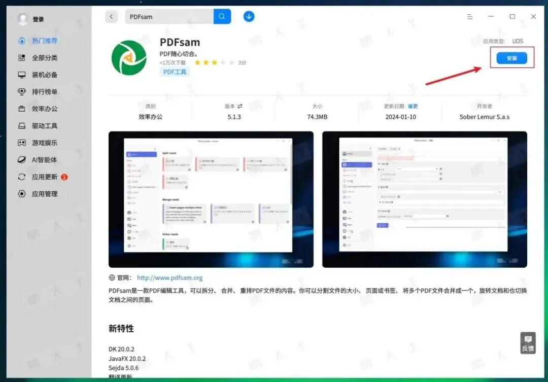 直接在统信UOS软件商店中搜索PDFsam,点击安装即可。