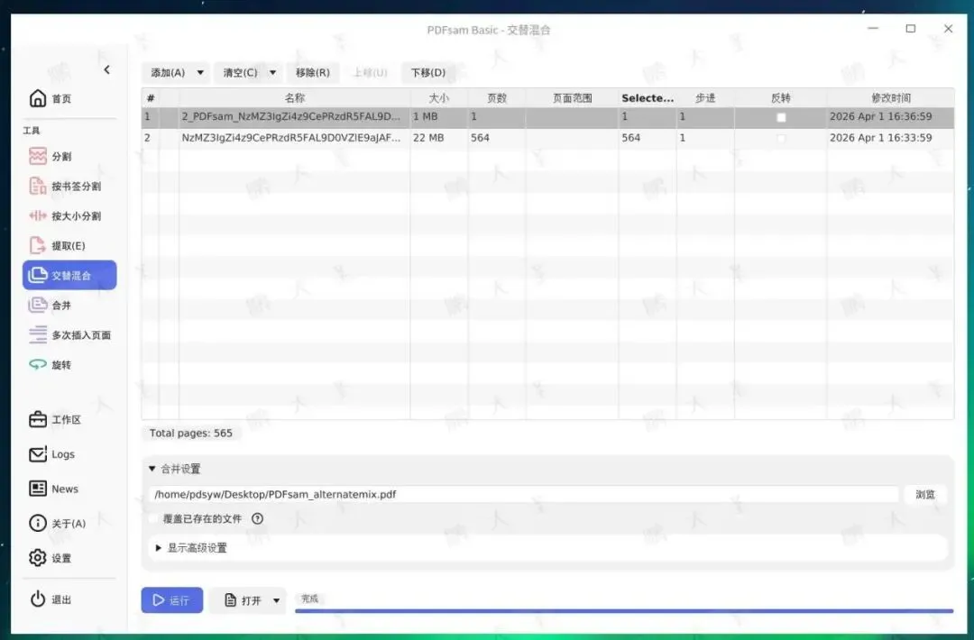 这个功能比较适合双面扫描后的文档整理。把奇数页、偶数页来源不同的两个PDF自动交替合并,非常适合扫描件修复。