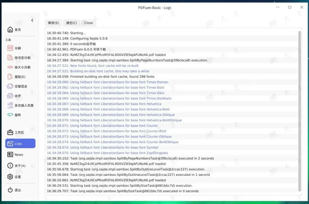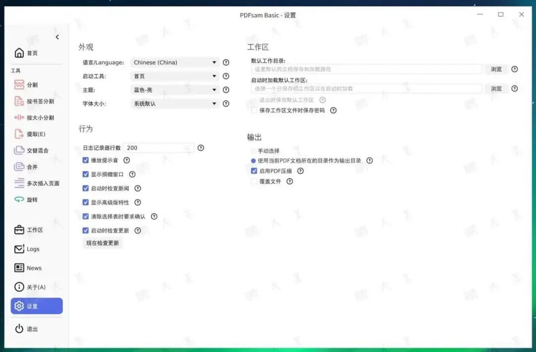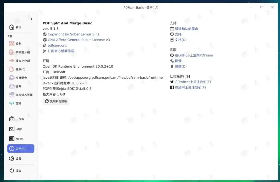 设置、日志、关于页面也比较完整:从使用细节来看,PDFsam作为桌面工具成熟度还是不错的。