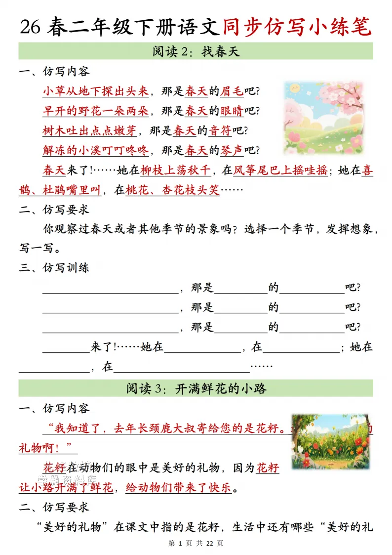 二年级(下)语文同步仿写小练笔,电子版可下载,同步教材每课内容。需要的家长抓紧打印出来,让孩子用起来。
