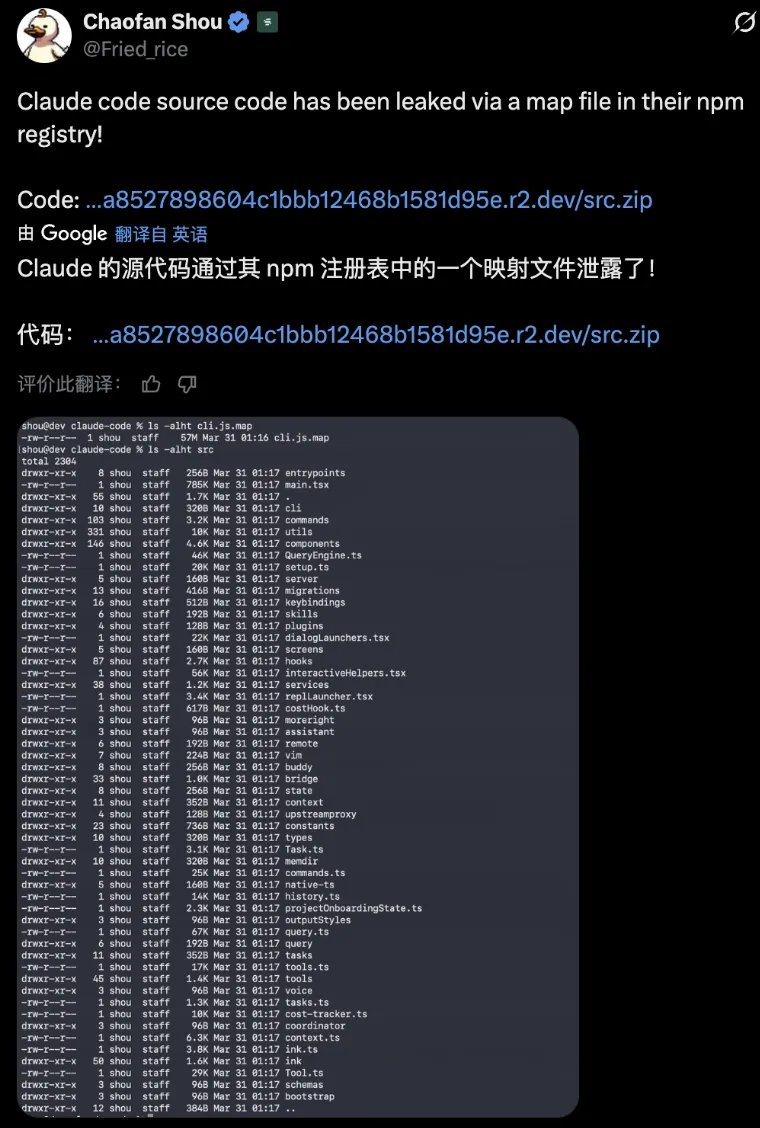 第一个发现的人,是个叫Chaofan Shou的实习生,他在X上发了一条推文:”Claude code source code has been leaked via a map file in their npm registry!”