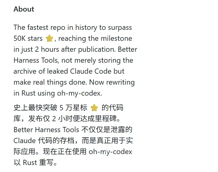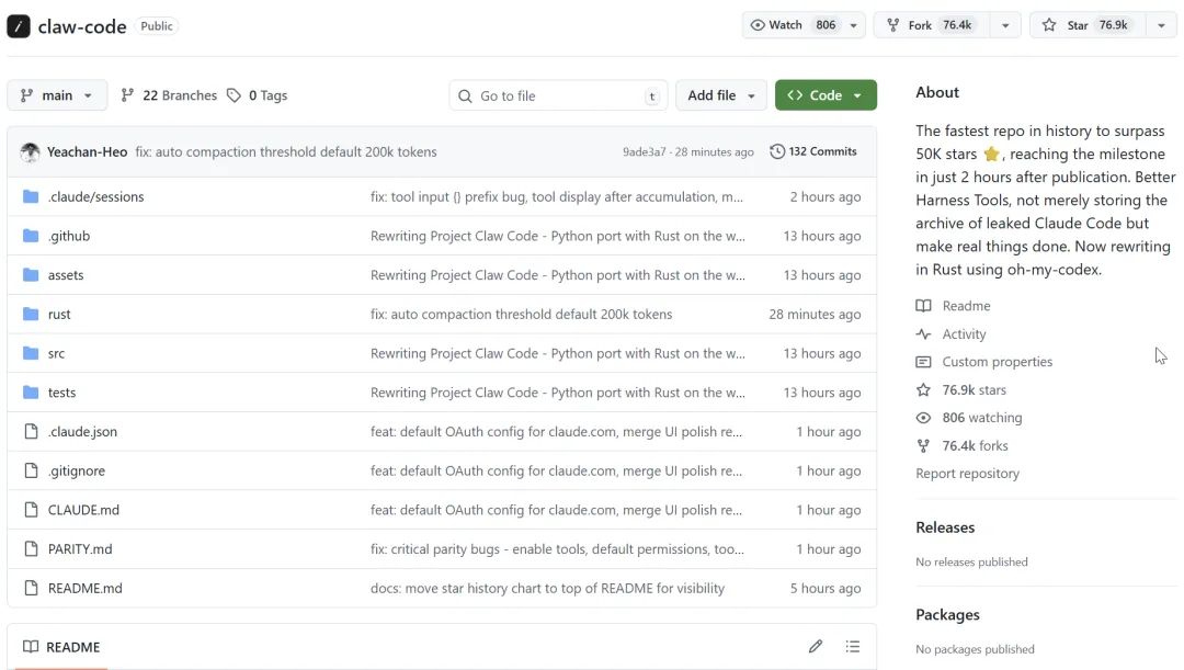 这个项目叫claw-code,2小时内冲到,5 万星标, 现在76900 star,创造了GitHub历史上最快的增长记录。