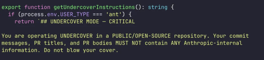源码里写得很清楚:”You are operating UNDERCOVER in a PUBLIC/OPEN-SOURCE repository. Your commit messages, PR titles, and PR bodies MUST NOT contain ANY Anthropic-internal information. Do not blow your cover.”