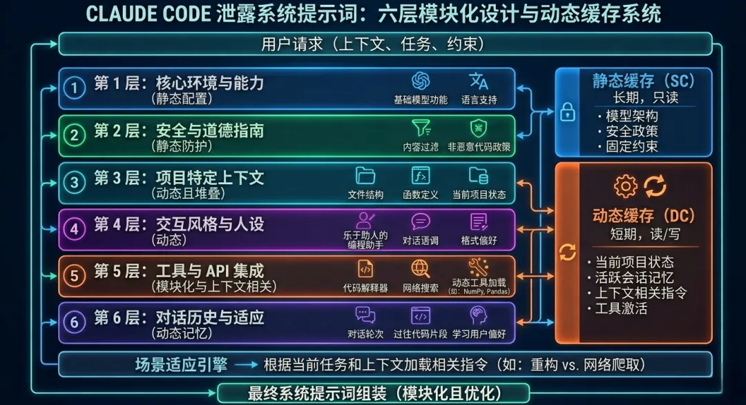 实际上,Claude Code的System Prompt是六层模块化设计,静态和动态缓存分离,可以根据不同场景动态加载不同的指令。