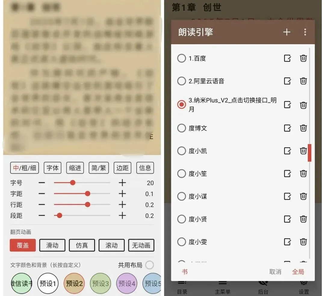 需要听书的小伙伴,推荐把朗读引擎改成第三个里面”DS”,没有很重的机械感!