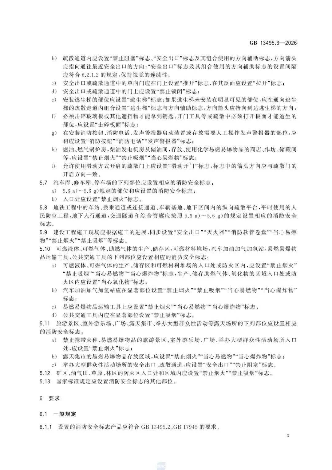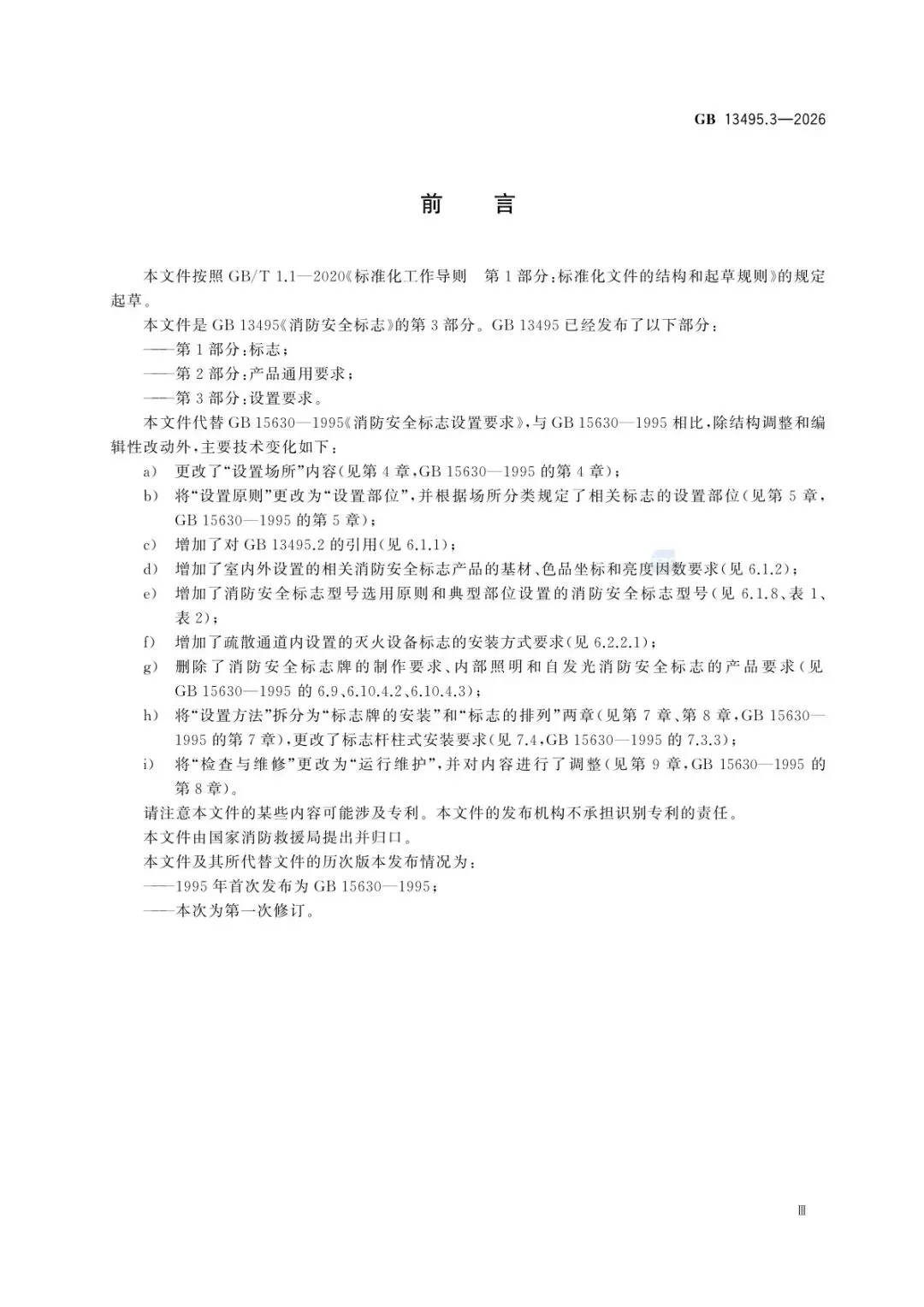 GB 13495.3-2026《消防安全标志 第 3 部分:设置要求》,2026年3月正式发布,2026年8月1日实施,全面替代实施 31 年的旧版 GB 15630-1995,是消防安全标志设置、运维、监管检查的最新法定依据。