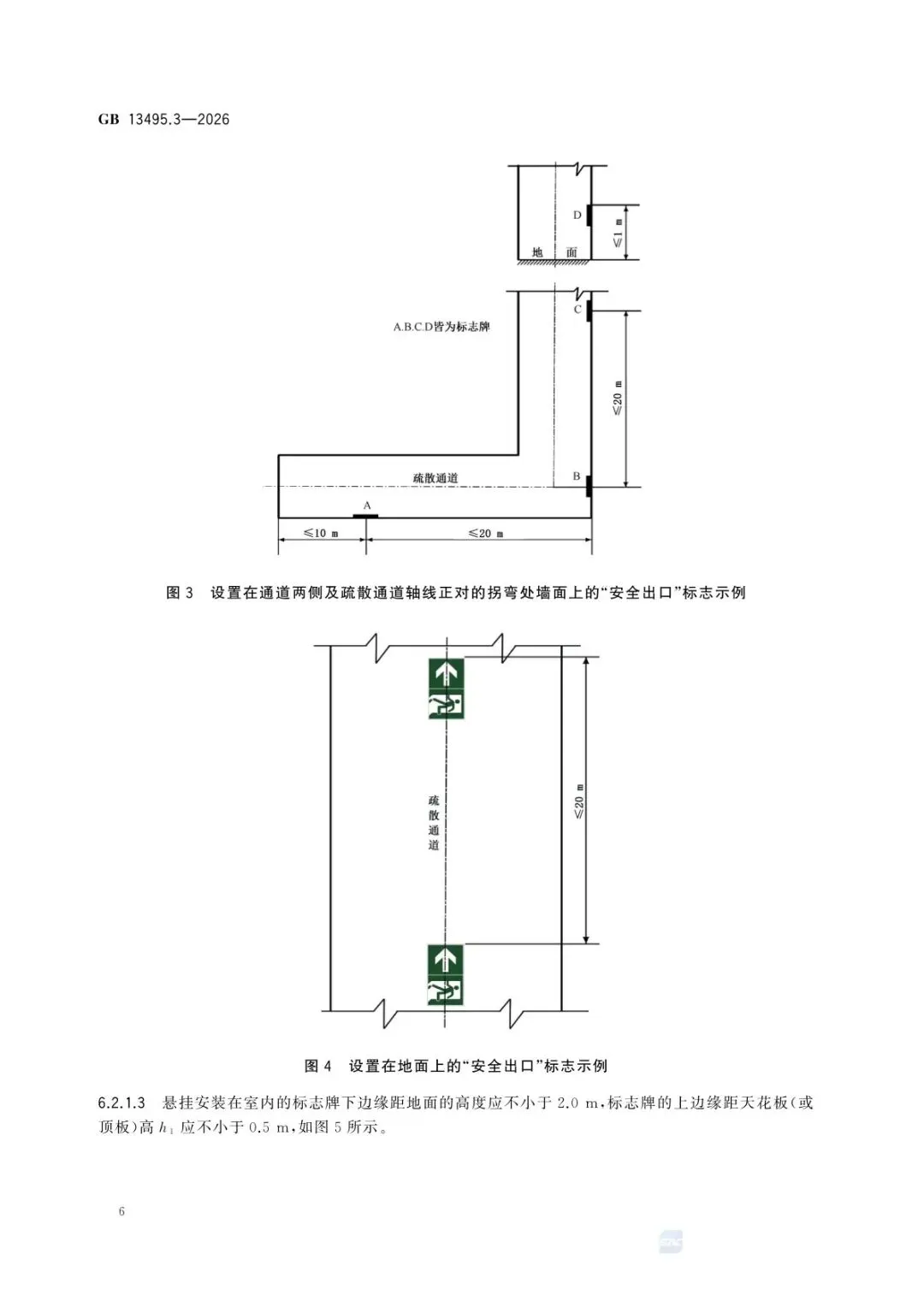 将条款进行了优化归类,分为 “一般要求”、“室内的消防安全标志设置要求” 和 “室外的消防安全标志设置要求”,以促进本标准在不同类型场所的使用(见 6 章,GB 15630—1995 的第 6 章)。删除了消防安全标志牌的制作材料要求、内部照明和自发光消防安全标志的产品要求(见 GB 15630—1995 的 6.9、6.10.4.2、6.10.4.3),这些要求在国家标准 GB 13495.2《消防安全标志 第 2 部分:产品通用要求》作了具体规定,本标准增加对 GB 13495.2 的引用。为了保障设置的消防安全标志发挥其应有的作用,规定了典型部位设置的消防安全标志的最小尺寸,并增加了保持标志视觉连续性的技术要求。