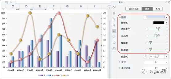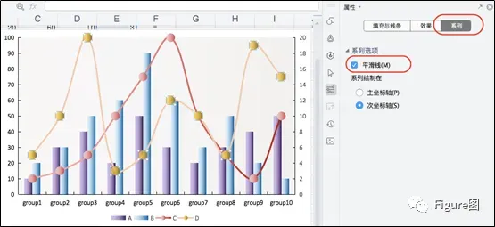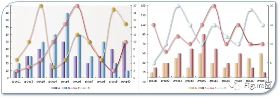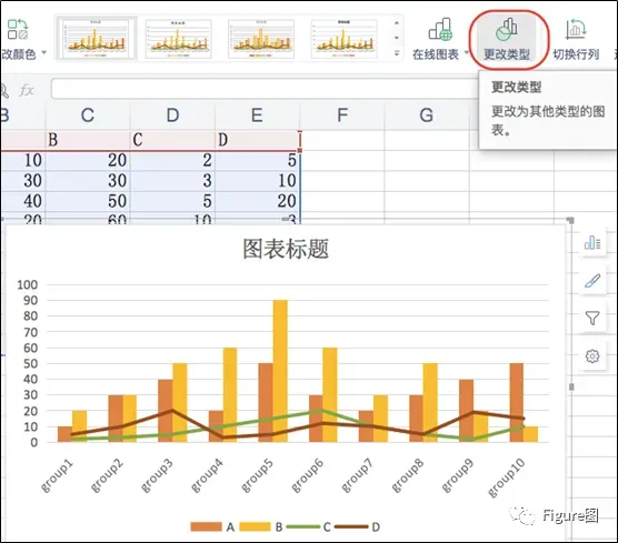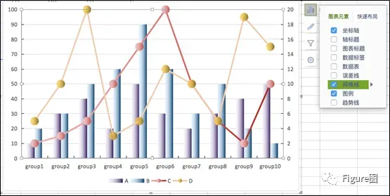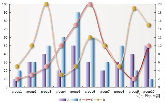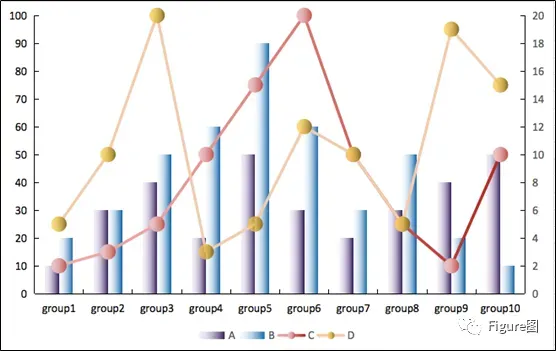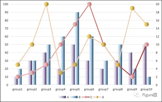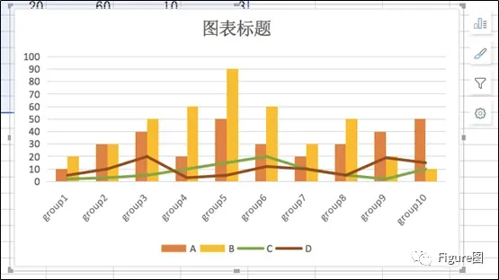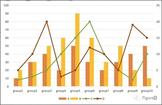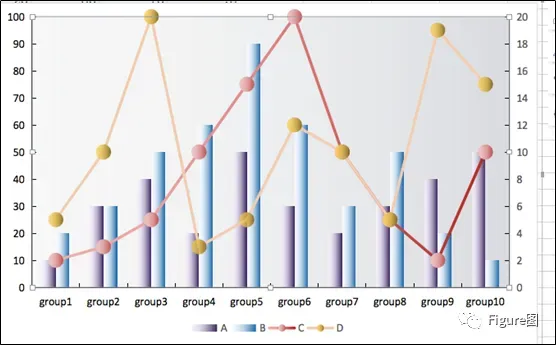 3. 插入后默认的图如下所示,这正是我们想要的展示模式,但是由于C、D数值相对较小,所以需要另设次坐标轴。