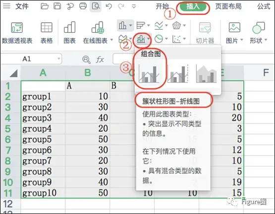 2.选中数据,依次点击“插入”→“组合图”→“簇状柱形图-折线图”,插入图表。