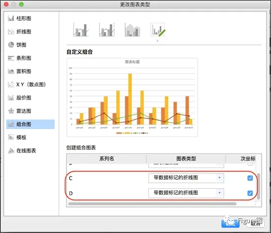 5. 在弹出的“更改图表类型”对话框中重新将C、D的类型改为“带数据标记的折线图”,并均选择次坐标。