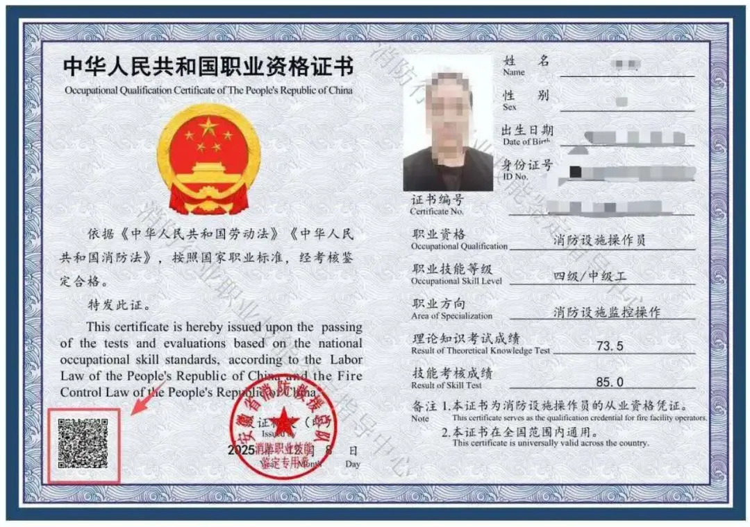 消防设施操作员职业资格证书样式