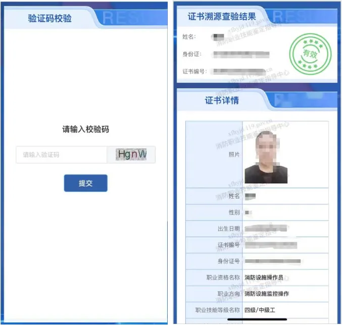 通过扫描电子证照上的查验二维码,或者登录技能人才评价证书全国联网查询网、消防职业技能鉴定考试网、“消防行业职业技能鉴定指导中心”公众号等方式,可查询核验电子证照信息。