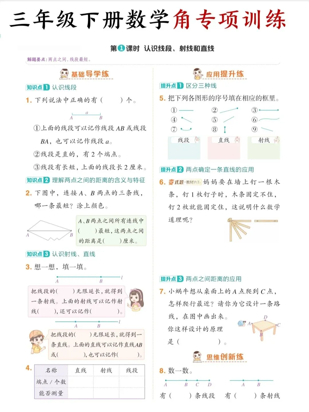 通过持续训练,学生可熟练掌握角的相关知识,提升解题准确率与速度,为后续学习三角形、四边形等几何内容打下扎实基础,是三年级学生数学提升的实用练习资料。