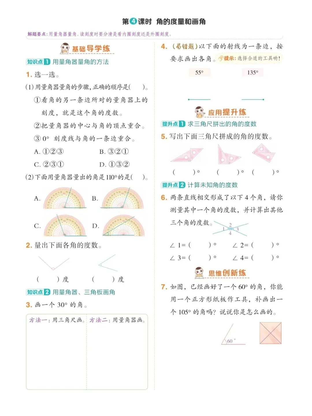 训练题兼顾基础与应用,包含数角、辨角、量角、画角等常见题型,贴合课堂教学与考试考点。学生通过规范使用量角器、按要求画出指定度数的角,能有效提升动手操作能力。