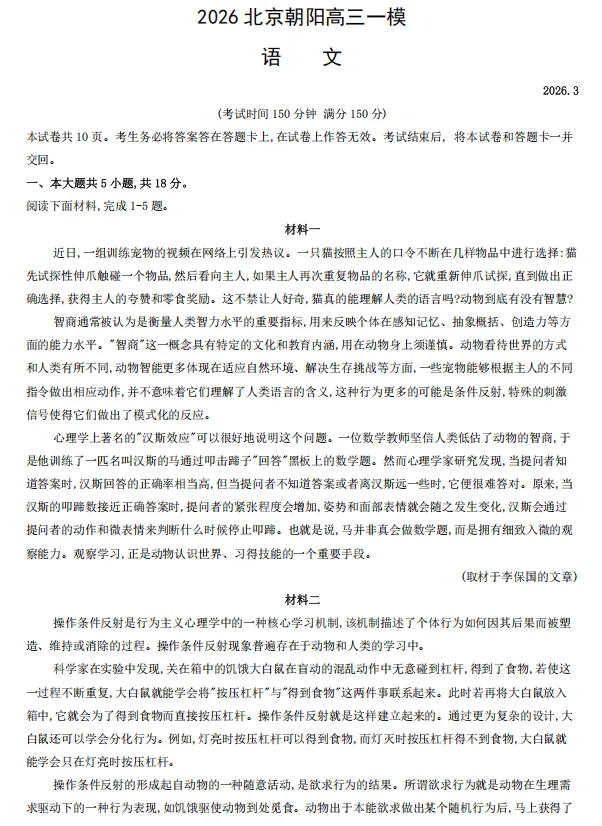 小编整理了2026年北京市朝阳区高三一模语文,PDF版!可以参考练习。